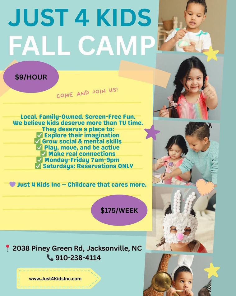 Join us this Fall at Just 4 Kids Drop-In Child Care for an unforgettable adventure from October 1 to November 31! Our exciting camp offers a wide array of activities including music, dance, crafts, art, and movie time, ensuring your child enjoys every moment. Open six days (Saturdays: By appointments only) a week for kids aged 12 months and older, we’re here to provide a safe, fun, and creative environment where children can thrive. Don’t miss out on the fall camp program. *Minimum 3 hours/day required to enroll in program*