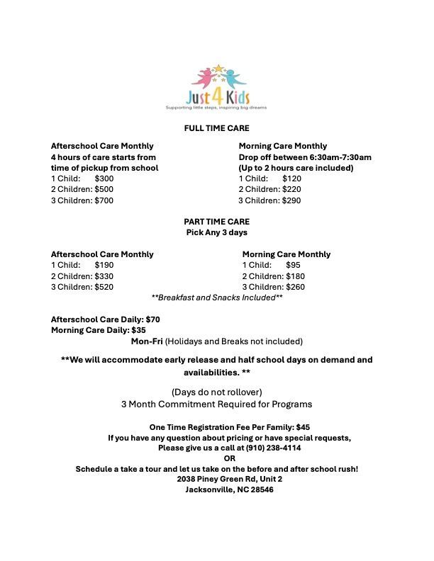 At Just 4 Kids, we understand how busy family schedules can be. That’s why our Before and After School Care Program is designed to provide a safe, reliable, and flexible solution for working parents. We provide dependable transportation to and from school, ensuring your child gets there safely and on time. Our dedicated staff offers attentive care before and after school hours, giving parents peace of mind. Your child will be in a secure, supportive setting where they can relax, socialize, or complete homework under guided supervision. Discover the difference Just 4 Kids can make in your family’s daily routine. Contact us today to learn more or schedule a tour!